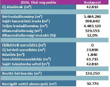 Az üresedési ráta 2026 első negyedévében 12,0%-on állt, ami 0,5 százalékpontos csökkenést jelent az előző negyedévhez, és 2,0 százalékpontos csökkenést az előző év azonos időszakához képest. 2026 első negyedévében a legalacsonyabb üresedési rátát Buda Központ alpiacon regisztráltuk (6,4%), míg a legmagasabb érték, változatlanul az Agglomerációban volt mérhető (20,0%). A méretváltozásokkal korrigált nettó abszorpció pozitív tartományban maradt 50.770 négyzetméterrel.