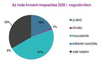 A teljes kereslet 2026 első negyedévében 130.250 négyzetmétert tett ki, ami az előző év azonos időszakához képest 40%-os növekedést jelentett, és amelyhez számottevően hozzájárultak az állami szektorhoz köthető ügyletek. A teljes keresleten belül a szerződéshosszabbítások 47%-os részesedéssel bírtak. A tulajdonosi használatú tranzakciók részesedése 33% volt, míg az új szerződések a bérbeadások 18%-át tették ki. A bővülések mindössze 1%-át adták a teljes keresletnek. Előbérleti megállapodást nem regisztráltunk a negyedévben.